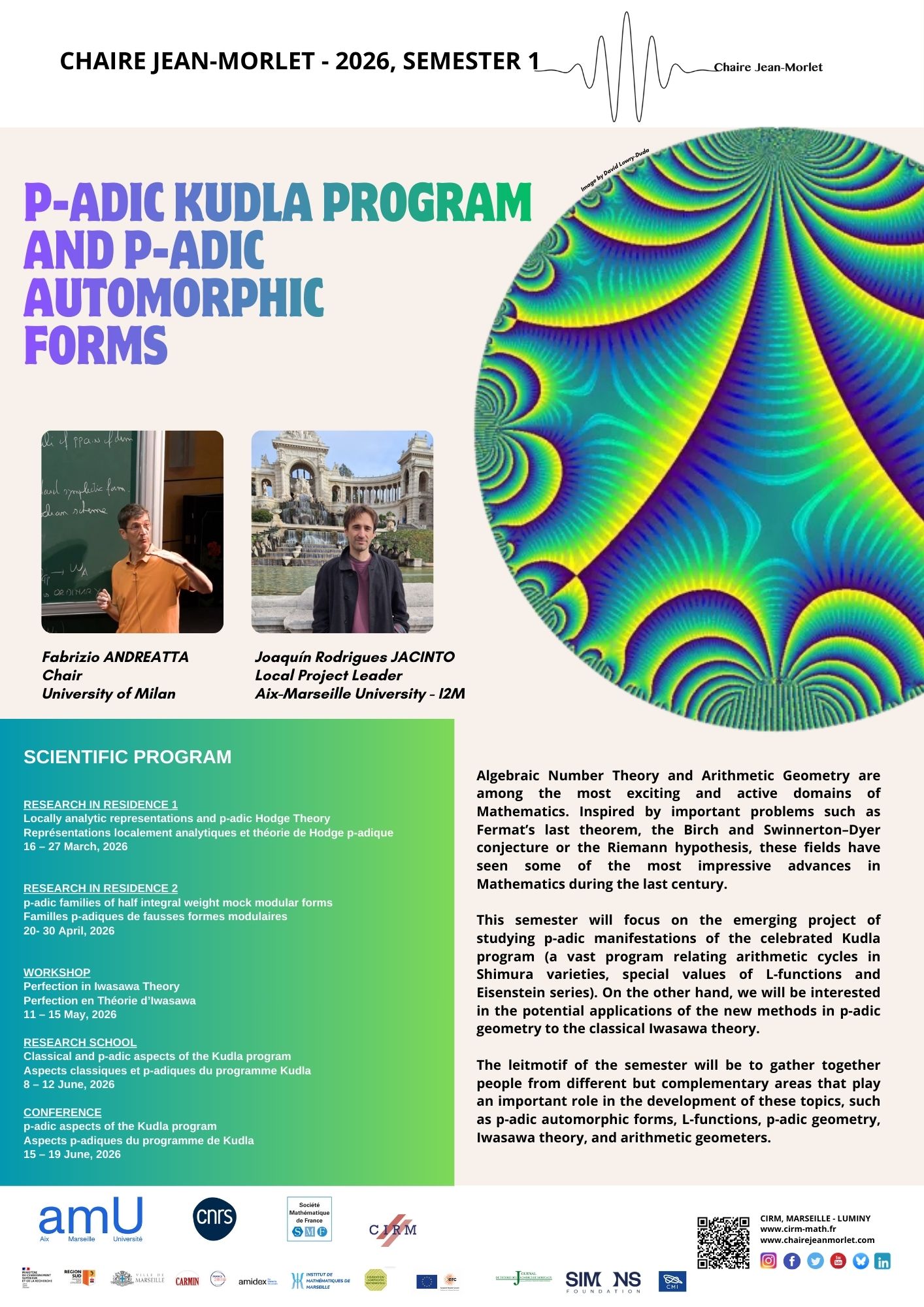 Created in 2013, the Jean Morlet Chair is a scientific program that aims to welcome internationally-acclaimed researchers for a six-month residence in the south of France. The Chair is open to all areas of mathematical sciences and their interactions and to theoretical physics.