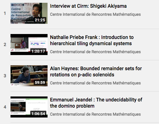 Basic terminology in tiling and point sets Tiling is a classical object. We first come back to the basic problem of its classification. Then we prepare notation of associated point sets and review basic notation of Delone set, Meyer set, Patterson set etc. Spectral property of tiling dynamical systems To deal with tiling dynamical system, we discuss its topology, the dynamical hull, minimality and unique ergodicity. Under unique ergodicity, we may discuss its spectral property in detail (see. [4, 1]). Tiling dynamical system can be produced by a finite amount of data if we have self-affine expansion and we review results in this case. Recurrence property of tilings When tiling is produced by cut and projection, its dynamical system shows pure discrete spectrum. In fact the converse almost holds (c.f. [3]). In such a pure discrete case, there are new developments on bounded remainder sets, and many classical Diophantine problems come into this field (see [2]). We shall discuss this connection during this course. References [1] M. Baake and R.V. Moody, Weighted dirac combs with pure point diffraction, J. Reine Angew. Math. 573 (2004), 61-94. [2] A. Haynes, H. Koivusalo, and J. Walton, Super perfectly ordered quasicrystals and the littlewood conjecture, ArXiv:1506.05649. [3] J.-Y. Lee, Substitution Delone sets with pure point spectrum are inter-model sets, J. Geom. Phys. 57 (2007), no. 11, 2263-2285. [4] B. Solomyak, Dynamics of self-similar tilings, Ergodic Theory Dynam. Systems 17 (1997), no. 3, 695-738. |